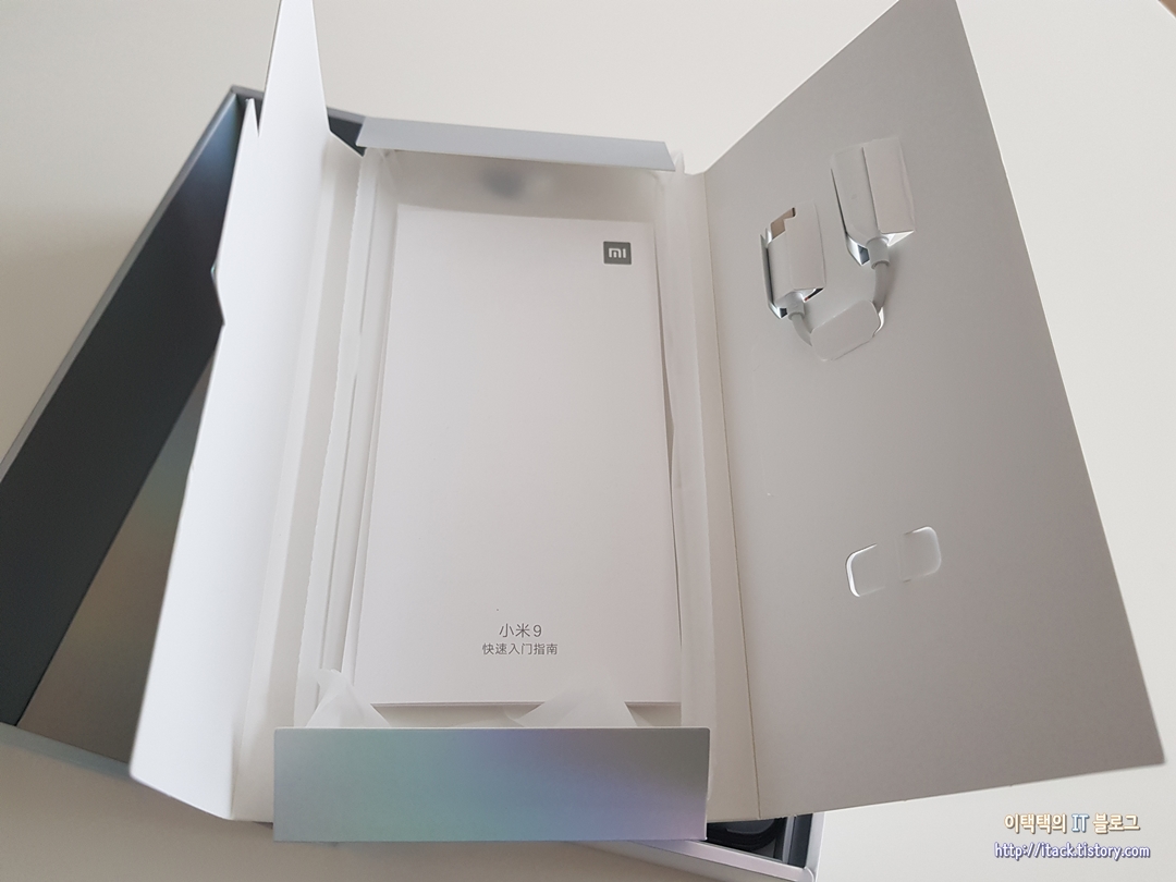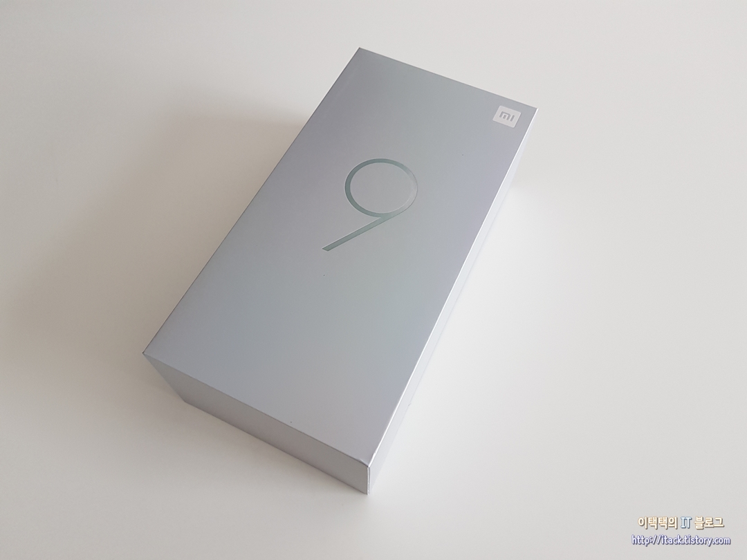 하얀색 박스를 열면 공장에서 출하 될 때 부터 붙어있는 보호필름으로 덮인 Mi9이 나옵니다.
