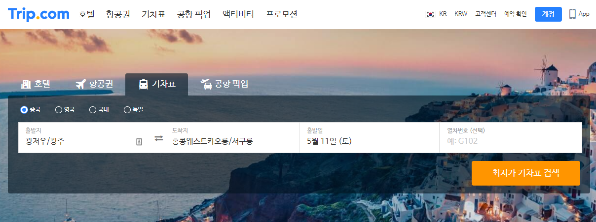 Trip.com 가서 기차표에서 광저우▶홍콩 웨스트 카오룽(서구룡) 역까지 기차표를 검색합니다.