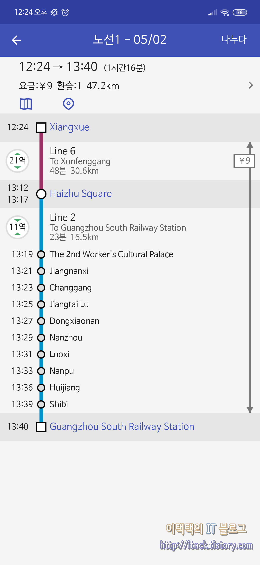 저는 향설 (香雪, Xiangxue)역 근처에 있기 때문에 지하철을 타고 광저우 남역 (广州南站, Guangzhounan)으로 갑니다.
