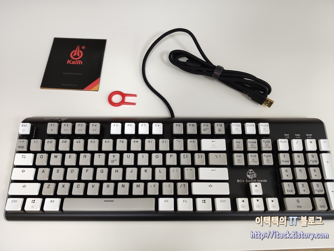 구성품은 키 캡 리무버 (저 빨간게 뭔지 몰랐어요), 키보드, 상품 소개(보증)서.